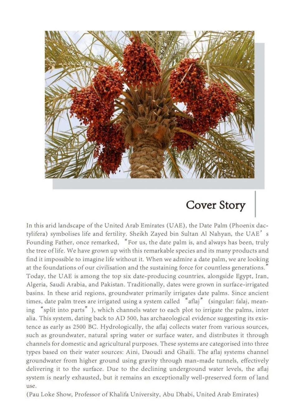 封面故事是《Agricultural & Rural Studies》的特色之一。每期封面向世界推荐中国或国外的一个乡村特色发展故事。第三卷第三期封面故事由Pau Loke Show教授撰写,讲述了阿联酋椰枣树的故事。在阿联酋干旱大地上,椰枣树象征生命与繁衍。国父扎耶德称其为“生命之树”。阿联酋现为全球六大椰枣产国之一。千年“法拉吉”地下水渠系曾以重力引泉灌溉,今因水位下降几近枯竭,仍见证永续农耕智慧。