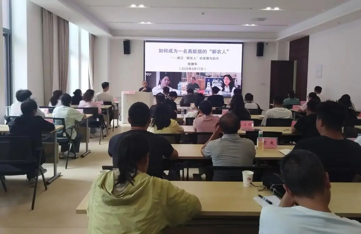 在四川长征干部学院甘孜泸定桥分院举行的泸定县2025年人才工作研修暨“新农人”培训班上,陈嫩华研究员作了题为《如何成为一名高能级的新农人:浙江新农人的发展与启示》的专题授课,从新农人的历史背景、发展机遇、职业路径、能级提升以及以省级试点为契机营造发展环境等方面,为70多名乡镇部门领导和新农人们进行了辅导。