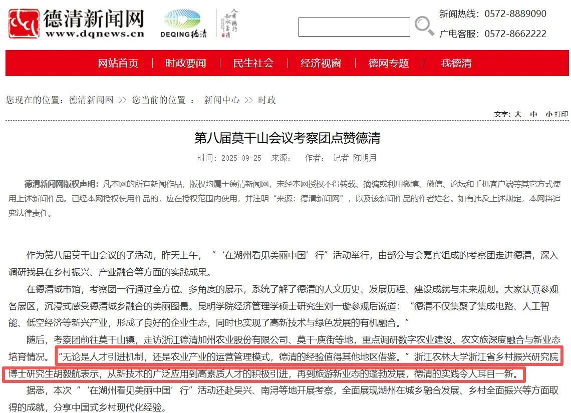 近日,张俊飚教授团队博士生、浙江省乡村振兴研究院学生工作站成员胡毅航,受邀参加“在湖州看见美丽中国”实地考察活动并接受当地媒体采访,其相关观点已在德清新闻网发布。