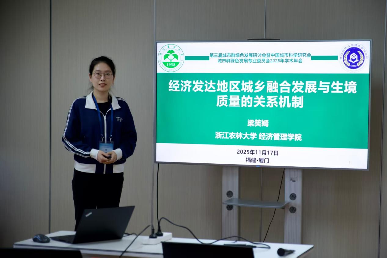 2025年11月16日至18日,第三届城市群绿色发展研讨会暨中国城市科学研究会城市群绿色发展专业委员会2025年学术年会在福建省厦门市顺利召开,来自中国科学院城市环境研究所、中国科学院生态环境研究中心、生态环境部环境规划院、清华大学、北京大学、Universidade Federal de Minas Gerais、Water & Ecology 编辑部等高校和科研机构近300名专家学者参会。我院外联部部主任徐彩瑶副教授应邀带领团队硕士研究生梁笑嫣一同参会。