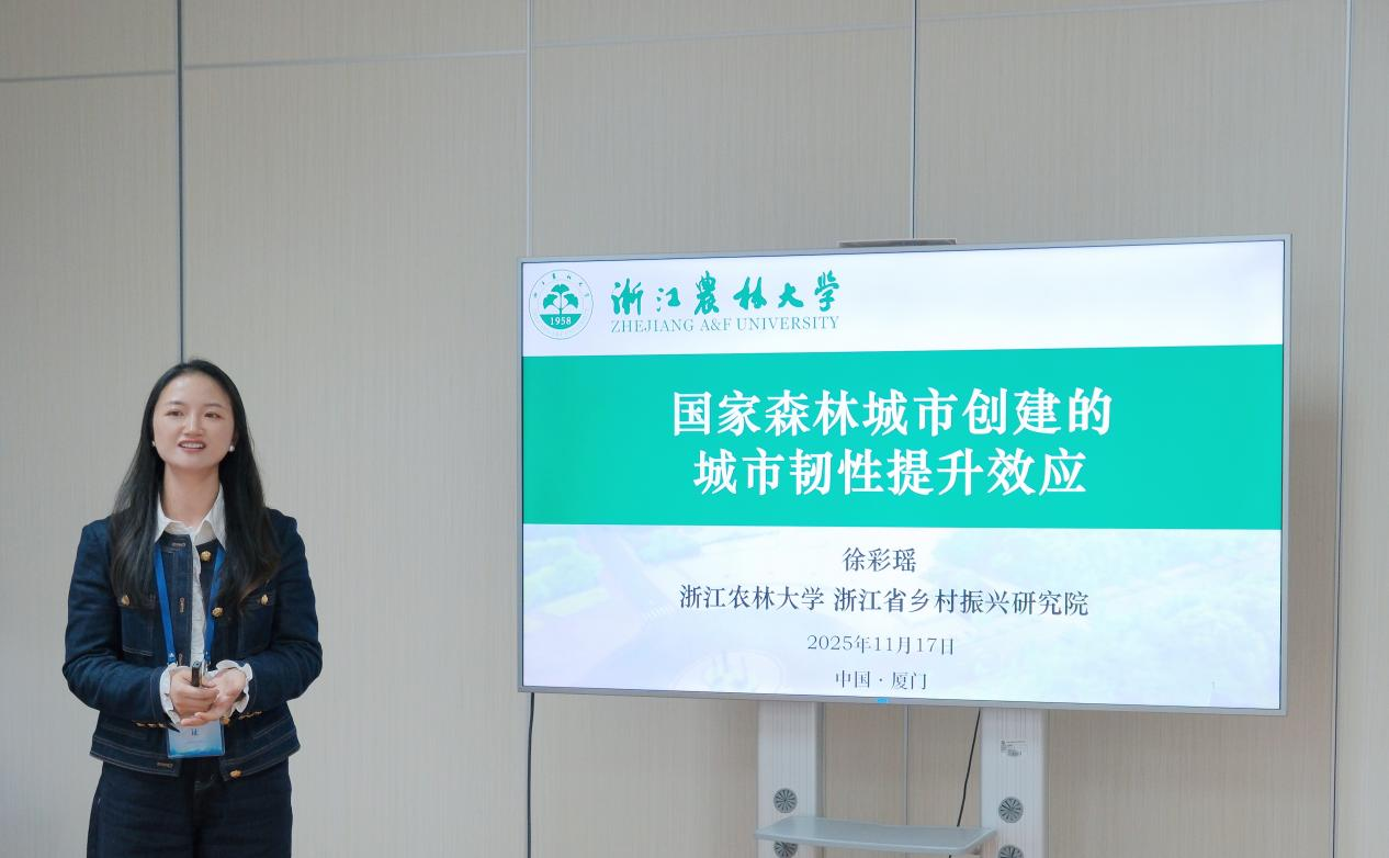 分会场环节,徐彩瑶副教授应邀担任“城市和区域可持续发展的生态系统服务路径”分会场召集人并作为评议人,同时做了题为《国家森林城市创建的城市韧性提升效应》的专题报告。报告指出,提升城市韧性既是落实国家“双碳”战略的关键环节,也是响应联合国2030年可持续发展议程中“可持续城市和社区”目标的重要实践,更是当前城市规划与治理领域亟需破解的全球性难题。国家森林城市创建是中国推动生态文明建设、实现人与自然和谐共生的关键举措,对提升城市韧性具有重要意义。基于2000—2023年中国287个地级市面板数据,运用多期双重差分模型,系统探讨国家森林城市创建政策对城市韧性的影响、作用机制、异质性特征及多政策协同效应,为精准制定生态建设与城市韧性提升协同路径提供参考。