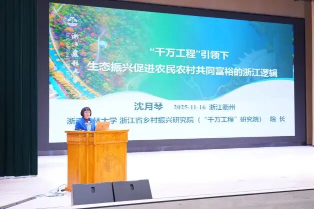 会上,围绕“生态共富”这一主题,沈月琴教授作了题为“‘千万工程’引领下生态振兴促进农民农村共同富裕的浙江逻辑”的报告,分别从历史、理论和行动逻辑进行了系统而深入的讲解。从历史逻辑的角度,系统阐述了“千万工程”、乡村振兴、共同富裕3个战略阶段的层层递进与一脉相承;从理论逻辑的角度,详细阐述了相关理论基础以及生态振兴如何促共富的逻辑框架;在此基础上,从行动逻辑的角度,结合生态产品特性和区域差异,分析了物质服务类、文化服务类、生态服务类三大类生态产品,浙江省各地分类分区域探索促共富的实践模式。