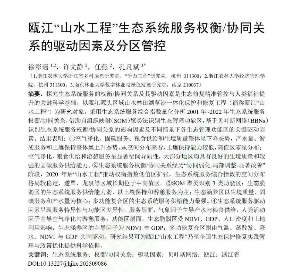 近日,由我院外联部主任徐彩瑶副教授为第一作者,孔凡斌教授为通讯作者,硕士研究生许文静和任燕为合作作者撰写的论文《瓯江“山水工程”生态系统服务权衡/协同关系的驱动因素及分区管控》在国内环境科学领域权威期刊、中国卓越领军期刊、EI检索期刊及CSCD核心期刊《环境科学》发表,现已在中国知网网络首发。该论文是孔凡斌教授主持承担国家自然科学基金面上项目(42371294)和国家社会科学基金重大项目(23ZDA105),以及徐彩瑶副教授主持承担的国家自然科学基金青年项目(42301328)的阶段性研究成果。