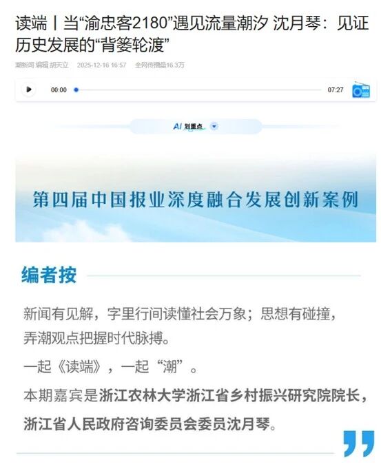 12月16日,潮新闻《读端》围绕“当‘渝忠客2180’遇见流量潮汐”话题采访我院院长沈月琴教授。