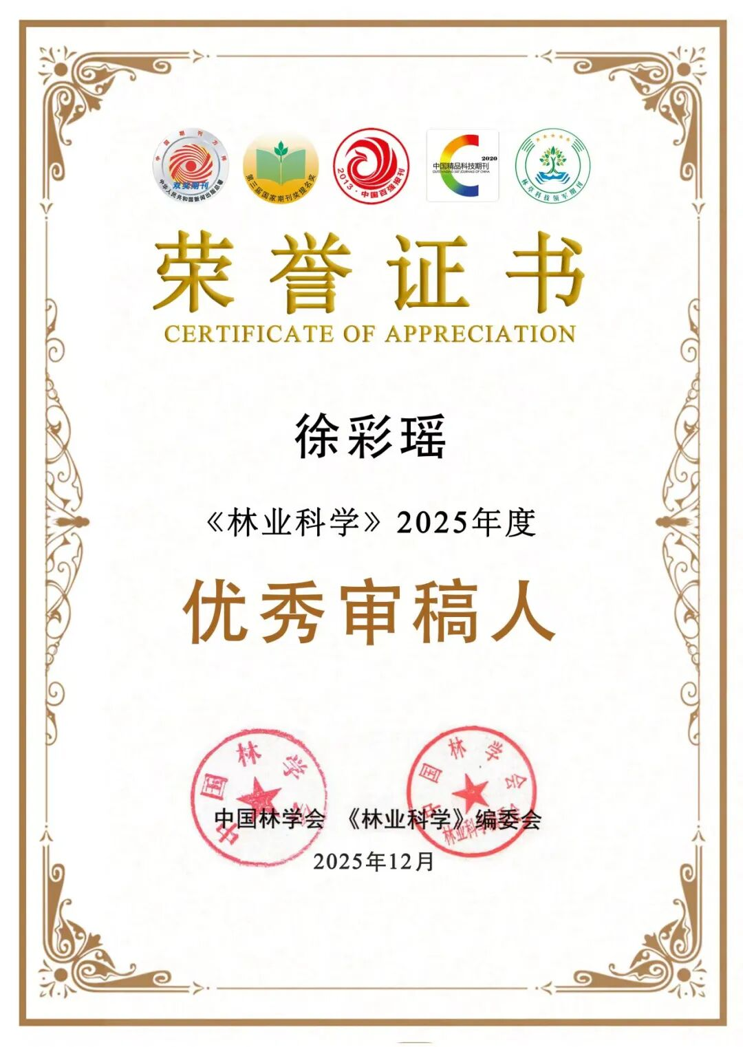 经过《林业科学》编辑部遴选,以2025年度的审稿数量、审稿时效性、审稿意见专业水平以及参与选题、策划组稿程度作为参考指标,评选2025年度“优秀审稿人”50名,我院徐彩瑶副教授位列其中。