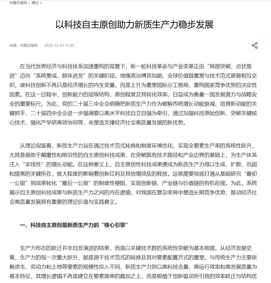 文章指出,生产力形态的跃迁并非自发演进的结果,而是以关键技术群的系统性突破为基本前提。从概念内涵上看,自主原创科技成果强调在基础理论、核心算法、关键材料及底层架构等领域实现“从0到1”的实质性突破。从经济学视角看,自主原创科技成果对新质生产力的作用机制主要体现在两条相互关联但又逻辑可分的路径之中。
