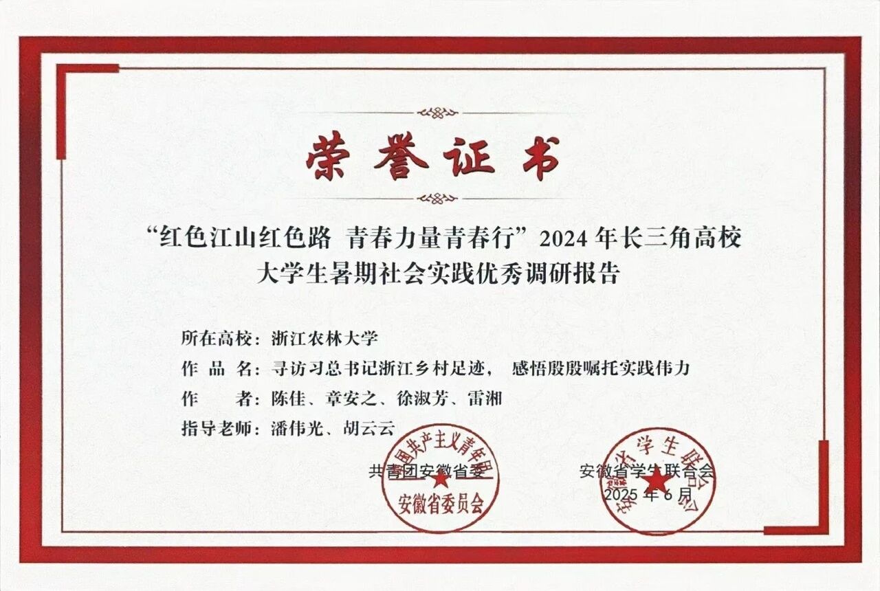此次获奖,不仅体现了我院老师在指导学生社会实践、服务国家战略方面的专业素养与责任担当,也展现了浙江农林大学学子将论文写在祖国大地上的青春风采与实践能力。调研成果为讲好浙江“千万工程”故事、助力乡村全面振兴贡献了青春智慧和力量。