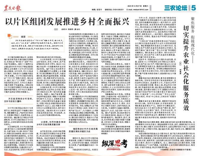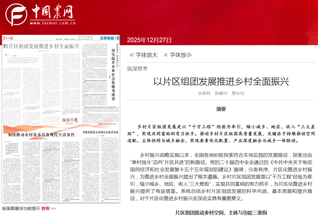 12月27日,由我院陈嫩华研究员参与撰写的理论文章《以片区组团发展推进乡村全面振兴》在《农民日报》发表。文章阐述了乡村片区组团发展的科学内涵、基本思路和提升路径,为片区化推进乡村振兴提供了理论参考。