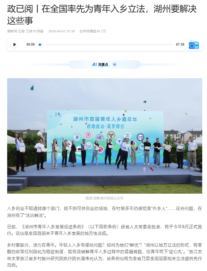 4月2日,我院执行院长潘伟光教授在《浙江日报》潮新闻“政已阅”栏目,就全国首部青年入乡发展地方性法规——《湖州市青年入乡发展促进条例》作出深度解读。