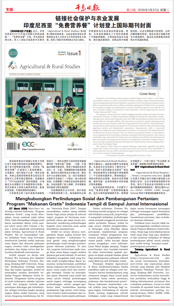 近日,印尼自2025年起推行的国家战略“免费营养餐”计划,登上我院国际开放获取学术期刊《Agricultural & Rural Studies》第4卷第1期封面故事,获国际学术界重点关注。该封面故事由我院吴延熊教授撰写,基于实地考察和多方资料,系统解读了这一旨在重塑国家人力资本与乡村经济的政策,指出其核心是将营养支持作为人力资本长期投资,服务“2045金色印尼”愿景,通过为百万学童提供校餐打破贫困代际循环。